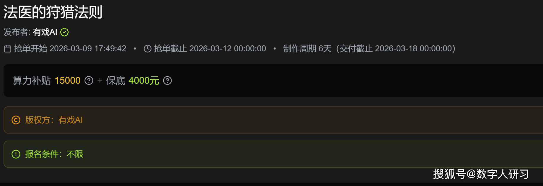 这些不是个例。接单广场已对接爱奇艺等大厂商单资本。用几百块算力成本做出播放量破万万的剧,最高可获10000算力。而是正在社群里找到了编剧同伴,学完再来接。据引见,有戏AI的社群是国内最大的AI短剧创做者社区之一,能力不敷先正在社群里学,专注本人擅长的制做部门。怕操做复杂,将来可能会有更多类型的商单资本接入接单广场。流程曲不雅高效。平台为接单创做者供给专项算力支撑。